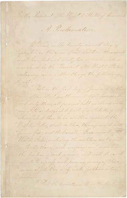 I, Abraham Lincoln, President of the United States of America, and Commander-in-Chief of the Army and Navy thereof, do hereby proclaim and declare that hereafter, as heretofore, the war will be prosecuted for the object of practically restoring the constitutional relation between the United States and the people thereof, in which States that relation is, or may be, suspended or disturbed; that it is my purpose, upon the next meeting of Congress to again recommend the adoption of a practical measure tendering pecuniary (monetary) aid to the free acceptance or rejection of all slave States, so called, the people whereof may not then be in rebellion against the United States, and which States may then have voluntarily adopted, or thereafter may voluntarily adopt, immediate or gradual abolishment of slavery within their respective limits, and that the effort to colonize persons of African descent, with their consent, upon this continent, or elsewhere, with the previously obtained consent of the Governments existing there, will be continued; that on the first day of January in the year of our Lord, one thousand eight hundred and sixty-three, all persons held as slaves within any State, or any designated part of a State, the people whereof shall then be in rebellion against the United States shall be then, thenceforward, and forever free; and the executive government of the United States, including the military and naval authority thereof, will recognize and maintain the freedom of each persons, or any of them, in any effects they may make for their actual freedom; that the executive will, on the first day of January aforesaid, by proclamation, designate the States, or part of States, if any, in which the people thereof respectively, shall then be in rebellion against the United States; and the fact that any State or the people thereof shall on that day be in good faith represented in the Congress of the United States by members chosen thereto at elections wherein a majority of the qualified voters of such State shall have participated, shall, in the absence of strong countervailing testimony, be deemed conclusive evidence that such State and the people thereof, have not been in rebellion against the United States; that attention is hereby called to an act of Congress entitled “an act to make an additional article of war” approved March 13, 1862, and which act is in the words and figures following: