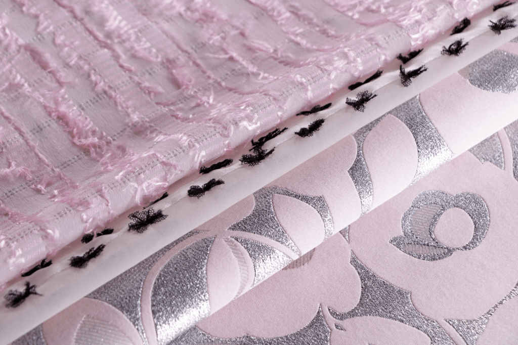 I also discovered another term. JACQUARD. Which means the design is woven directly into the fabric as the fabric is being woven using a JACQUARD LOOM. 🙂 As opposed to being embroidered in later…. 🙂